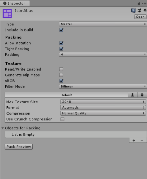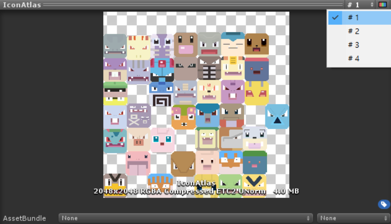 하단의 Pack Preview 버튼을 누르면 자동으로 생성된 아틀라스 이미지 확인할 수 있다. 그림에서 확인해볼 수 있듯이 지금 총 4장의 아틀라스 이미지가 자동생성된 것을 확인할 수 있다.
