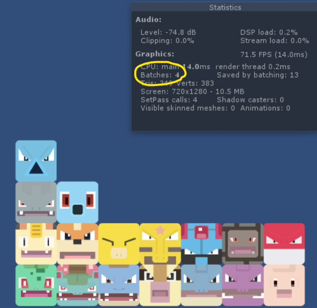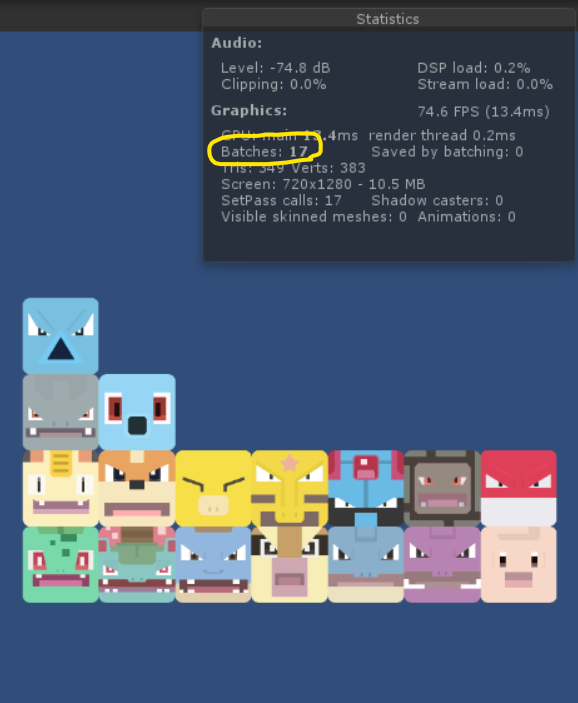 위의 그림을 보면 총 17장의 이미지를 띄우고 있고 Batches가 17이 되는것이 보인다. 위의 상태는 Sprite Atlas를 적용하지 않은 상태이며 GPU에게 총 17번 그림을 그려달라고 요청을 보낸것이라고 이해하면 되겠다.