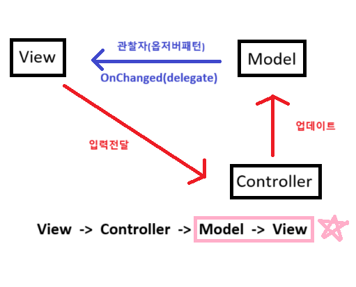 이 MVC에서 특징적인 부분은 Model과 View가 엄청 밀접하게 관계가 있다는 것이다. 보통 코드를 짤 때는 데이터는 한방향으로 흘러갔다가 다시 한방향으로 나오는 것이 좋다고 알고 있다. 즉, 사용자가 UI에 입력을 하면 UI는 그 데이터를 중간다리에 역할하는 곳에 전달하고 거기에서 데이터를 처리하고 처리된 데이터는 다시 들어왔던 곳인 UI로 역수출해서 데이터가 출력되는 흐름이 좋은 흐름이다.